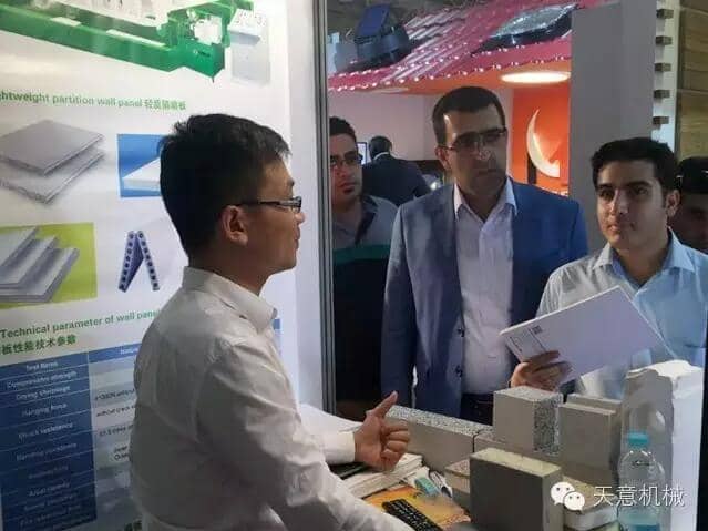 展會上,天意機械銷售經(jīng)理劉春剛細心的向前來咨詢的客戶,介紹了天意綠色建筑建材裝備在建筑行業(yè)內(nèi)的應用優(yōu)勢,通過觀看產(chǎn)品應用視頻以及展現(xiàn)成品樣塊,使得天意展位前門庭若市。期間,外貿(mào)部銷售經(jīng)理劉春剛,專程拜訪了天意公司在伊朗年產(chǎn)50萬平方的輕質墻板生產(chǎn)線合作伙伴。詳細了解客戶的生產(chǎn)情況,幫助客戶免費升級技術配方降低成本。