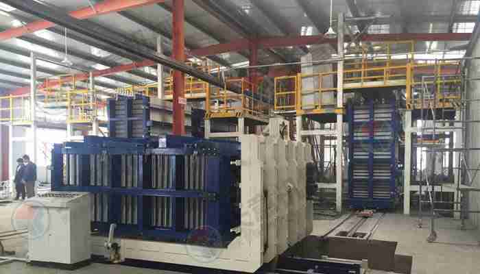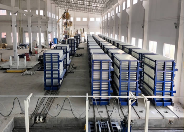該復(fù)合墻板生產(chǎn)線立式旋轉(zhuǎn)臥式出板復(fù)合墻板成型機,一次可生產(chǎn)四十塊墻板,該生產(chǎn)線主要分為:配料攪拌系統(tǒng)、墻板成型系統(tǒng)、液壓整體開模系統(tǒng)、液壓翻轉(zhuǎn)系統(tǒng)、整體出板翻轉(zhuǎn)碼垛系統(tǒng)、成型機自動循環(huán)系統(tǒng)、變頻擺渡系統(tǒng)、數(shù)控配電系統(tǒng)等部件 組成。該生產(chǎn)線自動化程度高,液壓開合模,解決了傳統(tǒng)立式復(fù)合墻板機人工開合安全隱患,提高了工作效率。設(shè)備配有整體出板碼垛系統(tǒng),解決了傳統(tǒng)人工出板方式,減少產(chǎn)品的破損率,提高了產(chǎn)能。生產(chǎn)線使用密封式泵送系統(tǒng)配備雙工位注漿槍,注漿速度快密實度高,材料粘結(jié)更緊密。