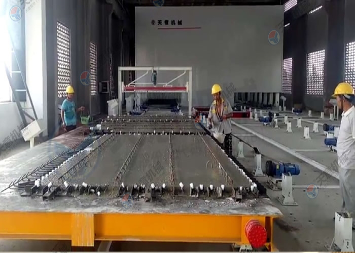 PC環(huán)形疊合板/內(nèi)墻板生產(chǎn)線的主要設(shè)備包括雙梁橋式起重機(jī)、清理機(jī)、脫模劑噴涂機(jī)、布料機(jī)、振動(dòng)臺(tái)、趕平機(jī)、拉毛裝置、預(yù)養(yǎng)窯、抹光機(jī)、碼垛車(chē)、養(yǎng)護(hù)窯、翻轉(zhuǎn)機(jī)、擺渡車(chē)、支撐滾輪、驅(qū)動(dòng)輪、模臺(tái)和成品運(yùn)輸車(chē)等。