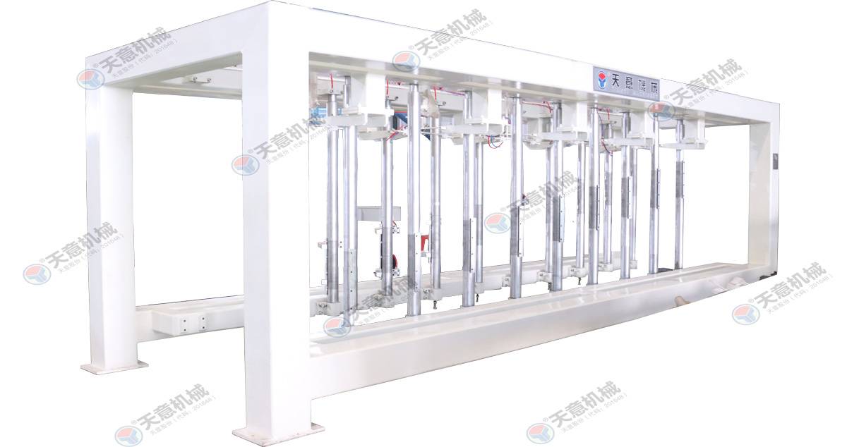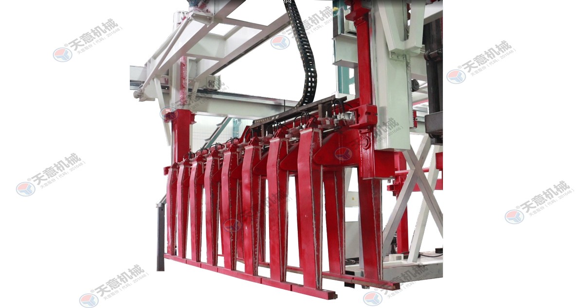 翻轉(zhuǎn)吊機:抓取模箱翻轉(zhuǎn)90°,側(cè)立在切割小車上進(jìn)行切割;切割工段空翻脫模機將??蚍D(zhuǎn)90°,放在切割小車支座上進(jìn)行脫模,脫模后的模框與清理后的側(cè)模板進(jìn)行合模,合膜后的空??虮坏踹\至模具回程軌道上進(jìn)行涂油處...