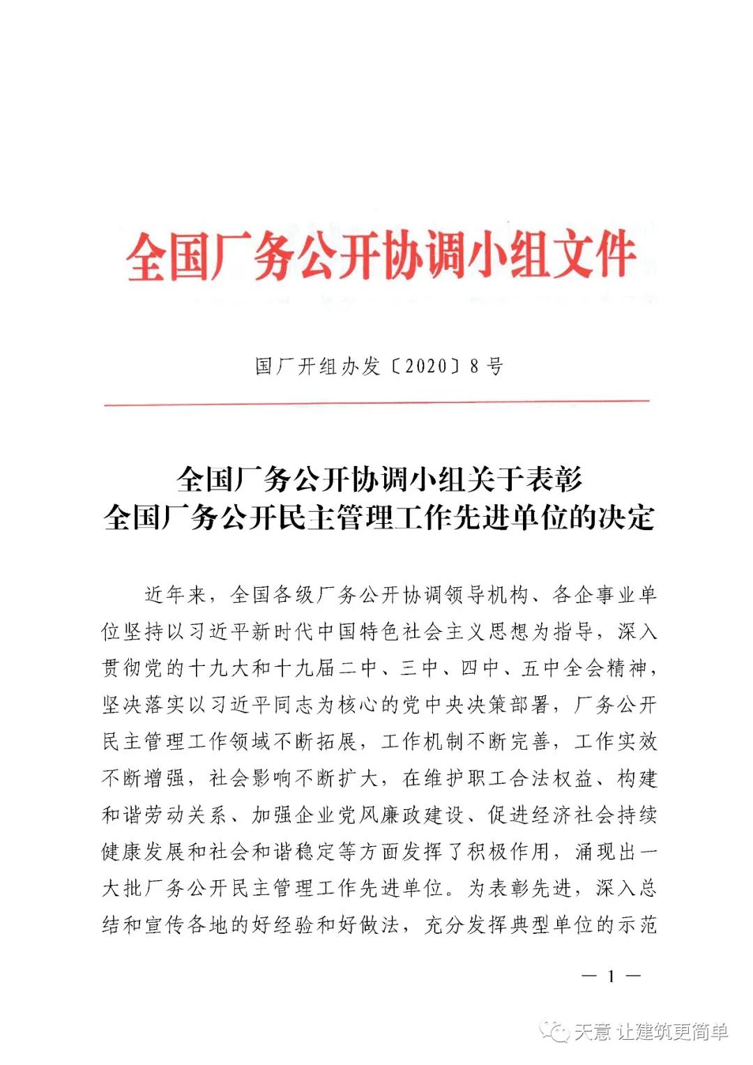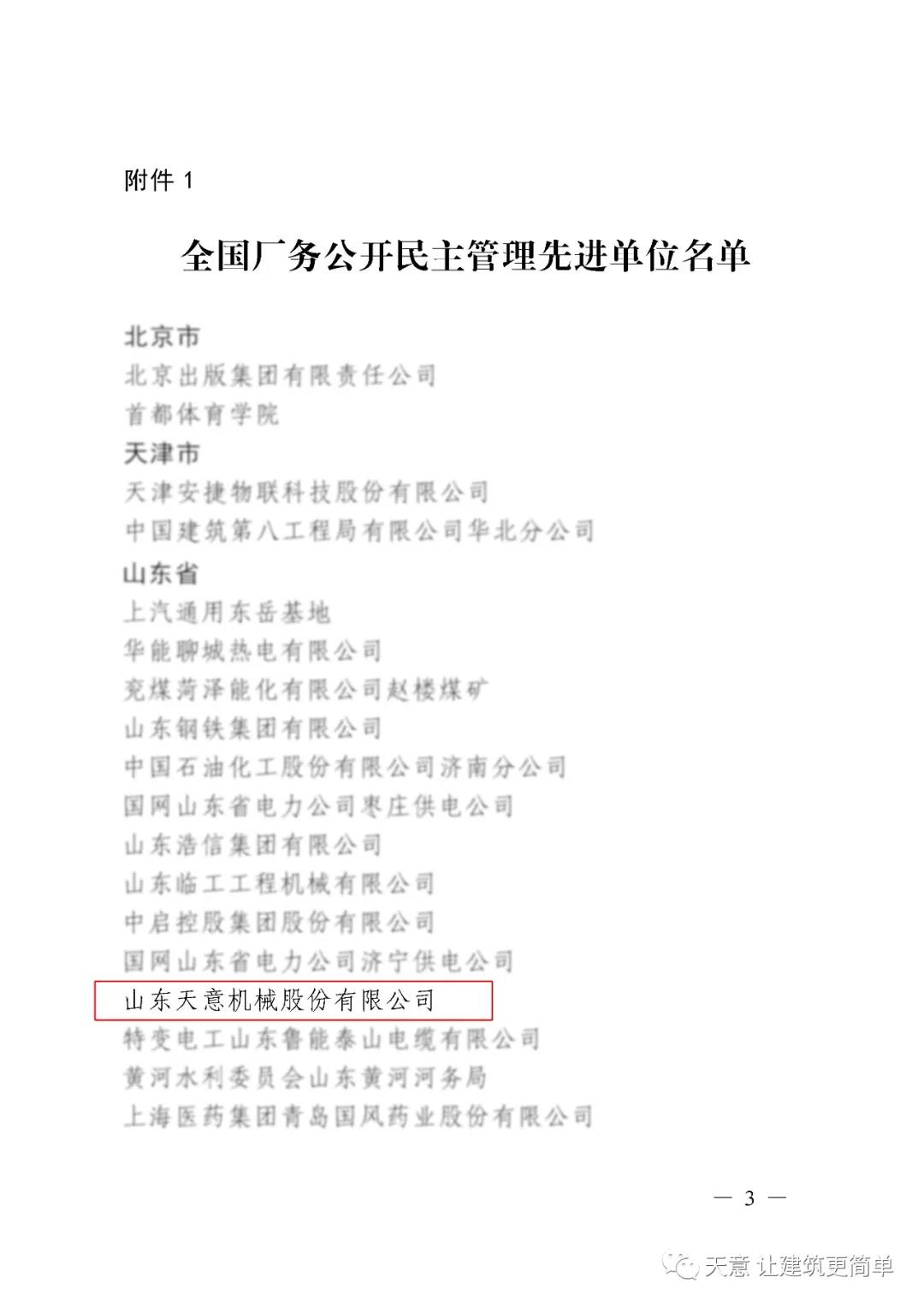 12月11日,從全國總工會(huì)傳來喜訊,山東天意機(jī)械股份有限公司被授予“全國廠務(wù)公開民主管理先進(jìn)單位”稱號。