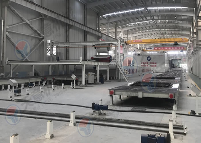 PC環(huán)形疊合板生產(chǎn)線采用高精度、高結(jié)構(gòu)強(qiáng)度的成型模具,經(jīng)自動布料機(jī)把混凝土澆筑其中、振動臺振搗后并不立即脫模,而是經(jīng)預(yù)養(yǎng)護(hù)、蒸汽養(yǎng)護(hù),使構(gòu)件強(qiáng)度滿足設(shè)計強(qiáng)度時才進(jìn)行拆模處理,拆模后的成品構(gòu)件運輸至成品暫存區(qū)或室外堆場,而空模臺沿輸送線自動返回,形成自動化環(huán)形流水作業(yè)。